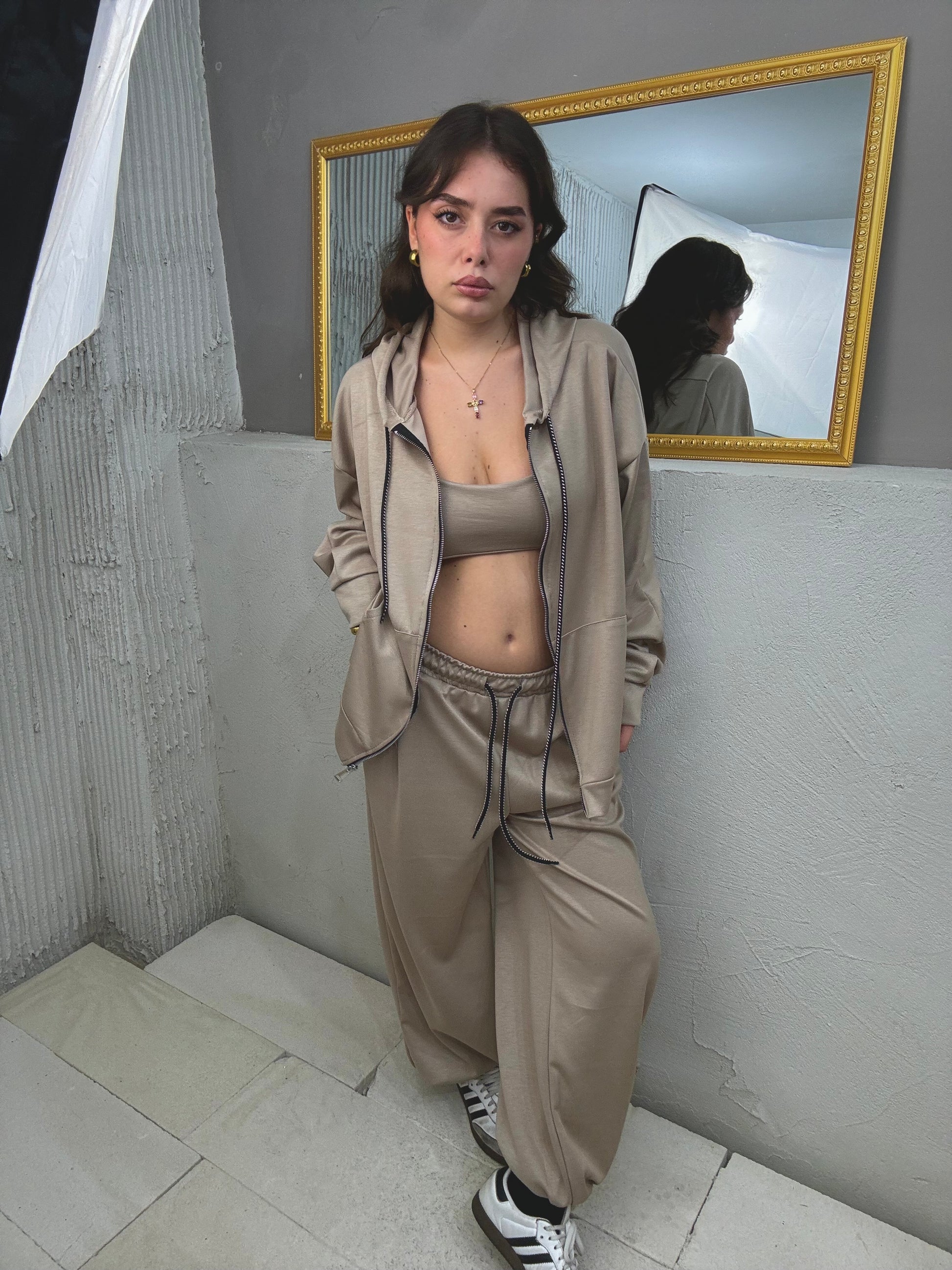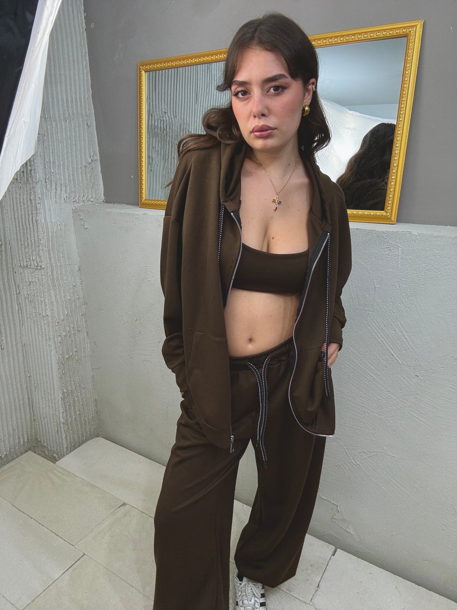 top + maxi felpa cappuccio e zip + pantalone molla
